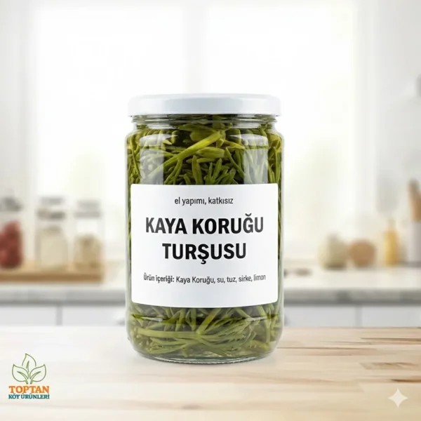 Mevsiminde yetişen en kaliteli Kaya koruğunden elde edilen turşu, tamamen katkısız olup hiçbir koruyucu ve katkı maddesi içermez. . Kaya Koruğu geleneksel yöntemlerle hazırlanmıştır.